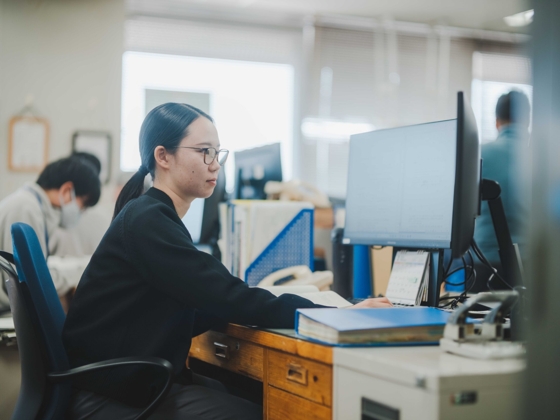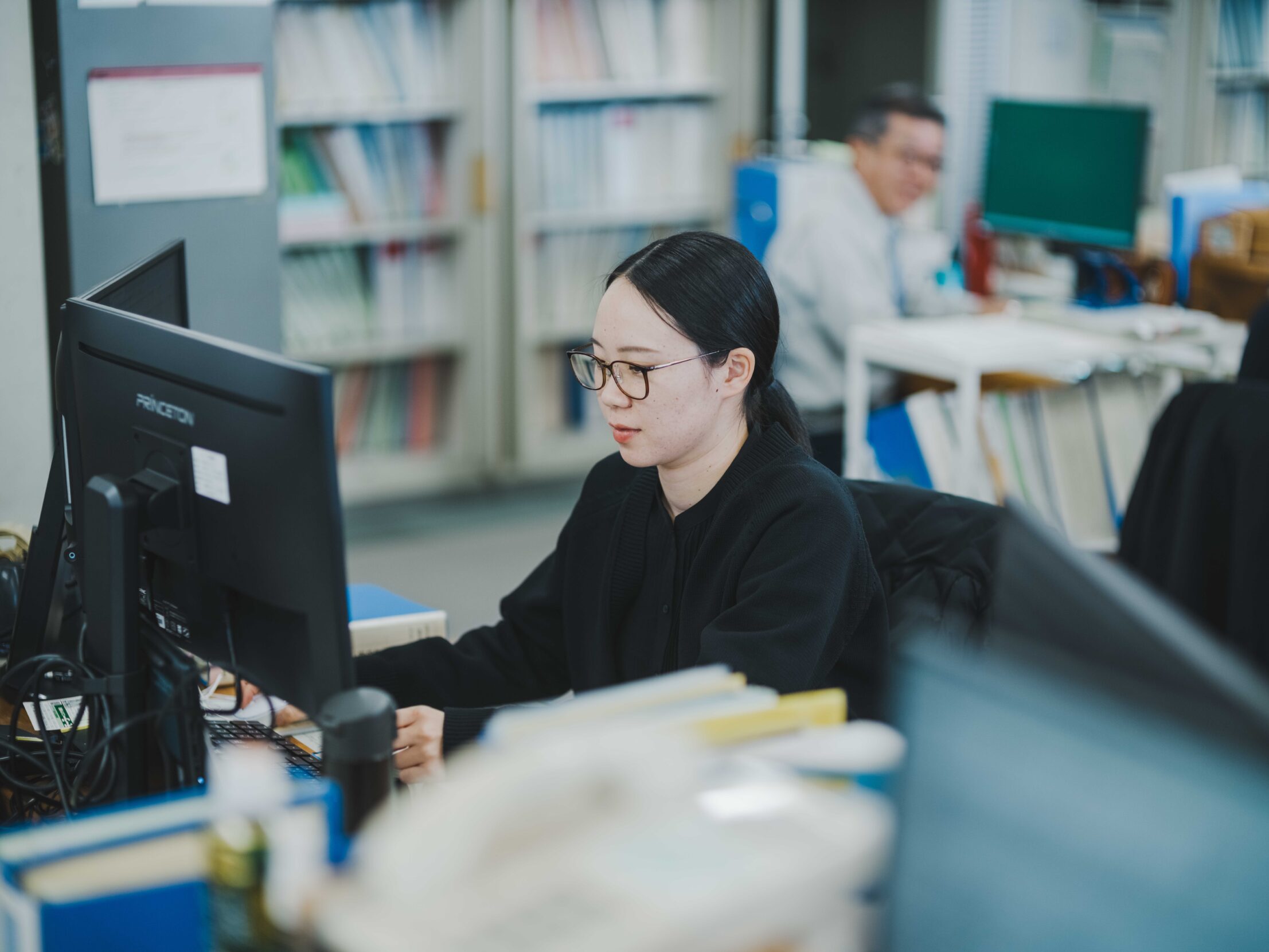 また、想像していたよりも、職場内外でのコミュニケーションが多く、他部署の職員や関係者と積極的に連携しながら業務を進めています。静かな環境で黙々と作業をするイメージとは異なり、活発なやり取りが求められる職場だと感じています。問い合わせにうまく答えられずに悩むこともありますが、いつも周りの方にフォローいただきながら経験を積むことが出来ています。