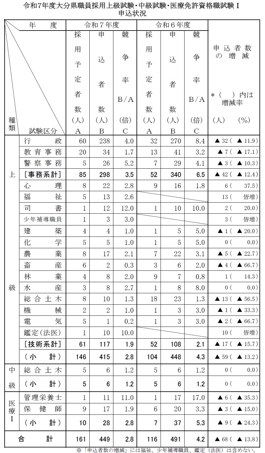NEWS お知らせ トップページ お知らせ 令和7年度大分県職員採用上級試験・中級試験・医療免許資格職試験Ⅰ 申込状況 新着情報 採用情報 2025.05.30 令和7年度大分県職員採用上級試験・中級試験・医療免許資格職試験Ⅰ 申込状況