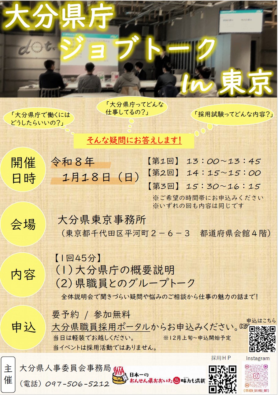 県職員の仕事の魅力を知ってもらうために、「大分県庁ジョブトークin東京」を開催します!